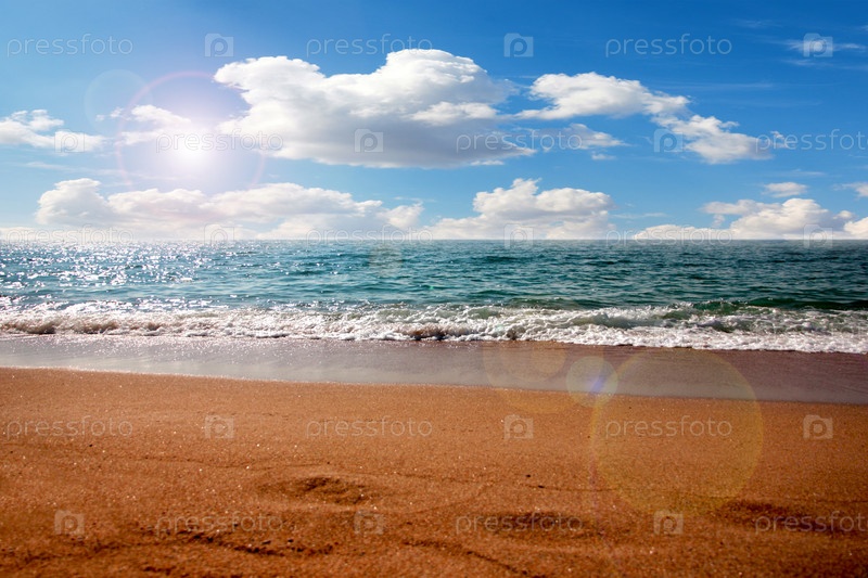 Красивый песчаный пляж средиземного моря и солнечное небо