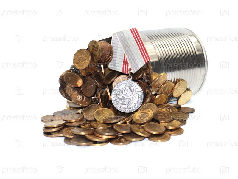 Монеты российские рубли в жестяной банке и медаль ветерана труда как символ успешного работника