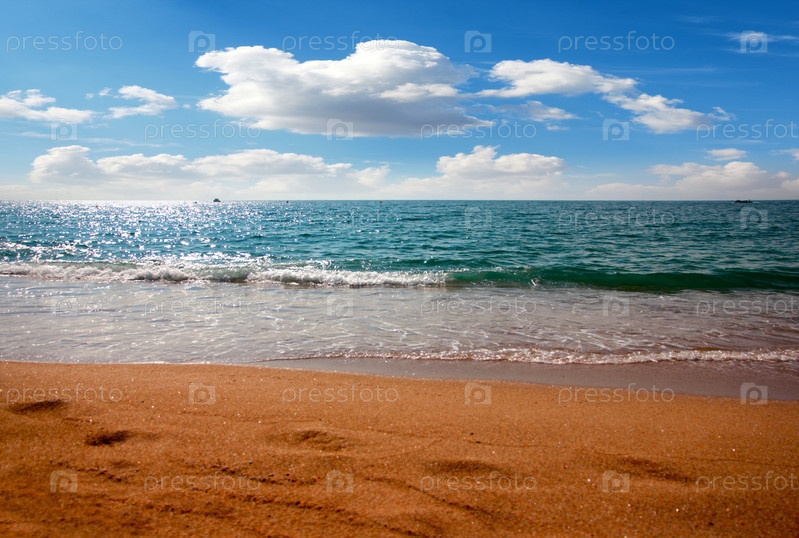 Красивый песчаный пляж средиземного моря и солнечное небо