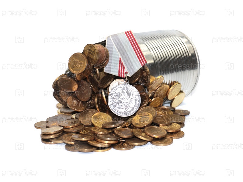 Монеты российские рубли в жестяной банке и медаль ветерана труда как символ успешного работника