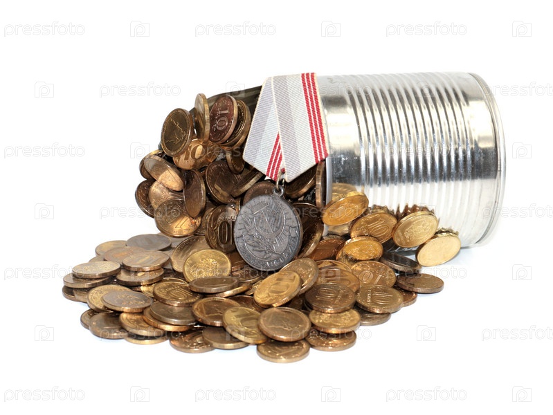 Монеты российские рубли в жестяной банке и медаль ветерана труда как символ успешного работника
