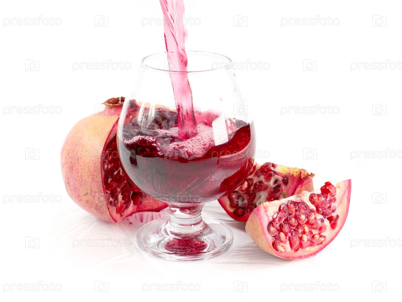Струйка гранатового сока в стакан и кусочки спелого яркого граната