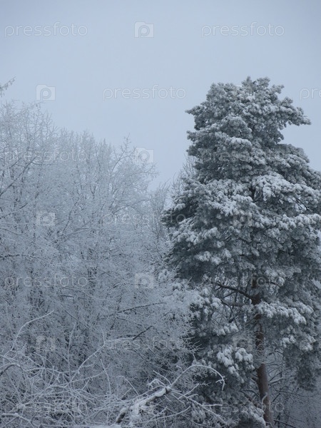 Одинокая заснеженная сосна на фоне серого хмурого неба зимой