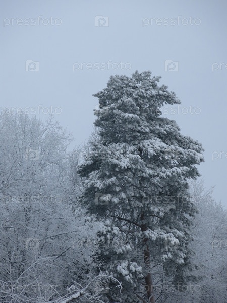 Одинокая заснеженная сосна на фоне серого хмурого неба зимой