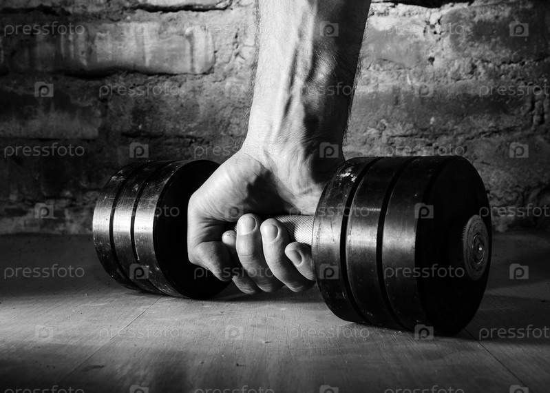 Мужская рука держит металлическую гантель