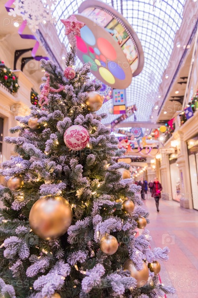 Москва, Россия - 20 декабря 2018 г.: Рождественские елки и праздничные украшения в универмаге ГУМ на Красной площади в Москве