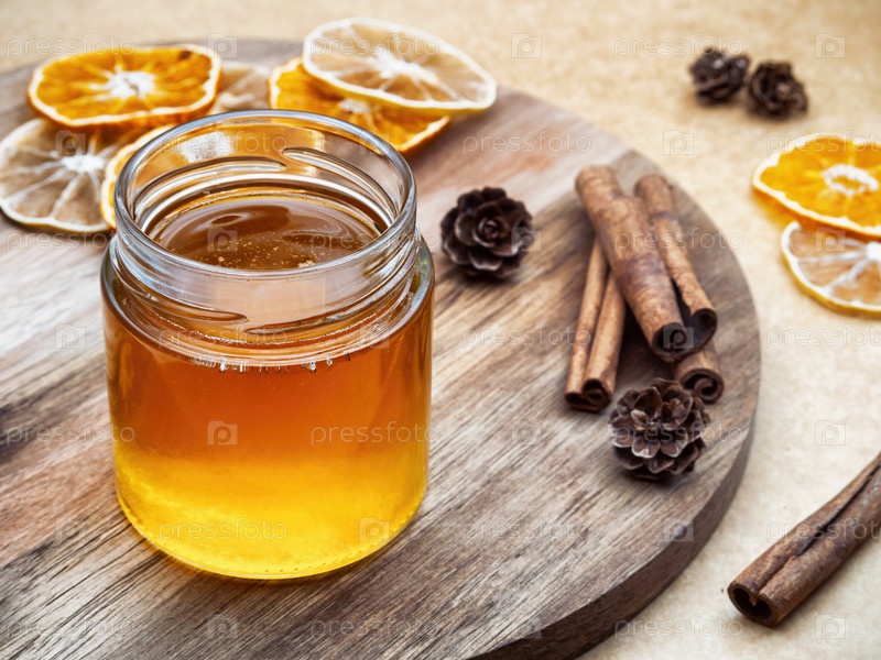 Прозрачная банка с медом на деревянном круглом подносе, окруженная корицей, сушеным апельсином и лимоном в теплых светлых тонах