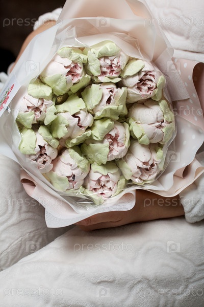 Зефирный букет. Зефирные тюльпаны. Натуральный домашний зефир. Упакован в бумагу в виде букета. В руках женщины. Крупный план