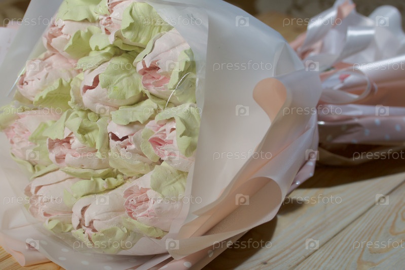 Зефирный букет. Зефирные тюльпаны. Натуральный домашний зефир. Упакован в бумагу в виде букета. На сосновых досках. Крупный план