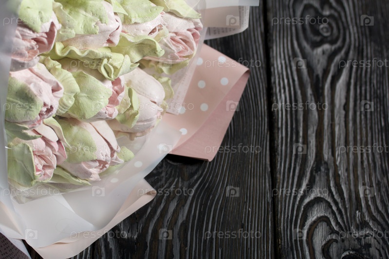 Зефирный букет. Зефирные тюльпаны. Натуральный домашний зефир. Упакован в бумагу в виде букета. На сосновых досках. Крупный план