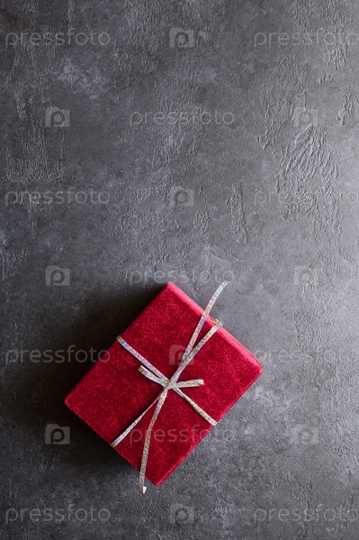 Красная подарочная бархатная коробка на сером фоне с копией пространства, вид сверху