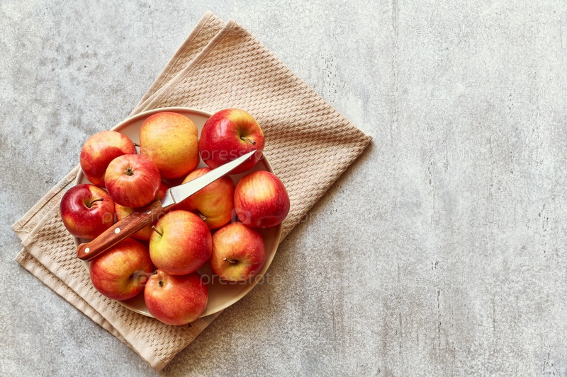 Спелые желтые и красные яблоки на тарелке, здоровое питание, вид сверху