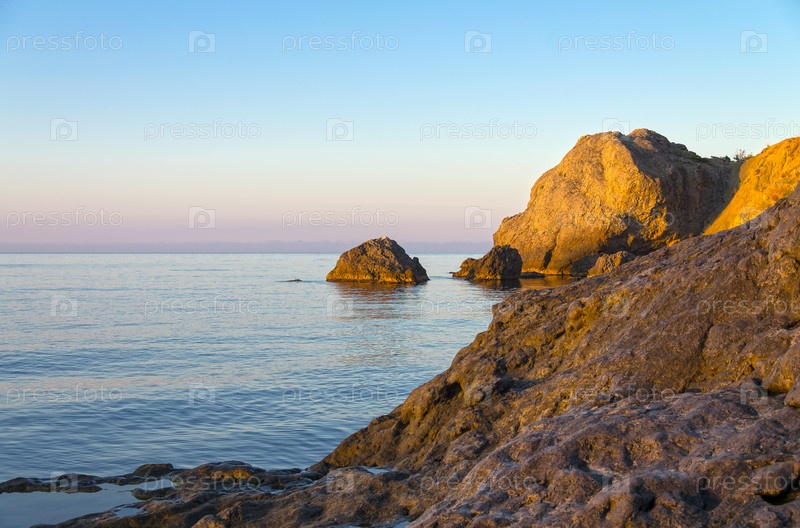 Тихое солнечное утро на берегу Черного моря. Прибрежные скалы. Крым, между Судаком и Новым Светом