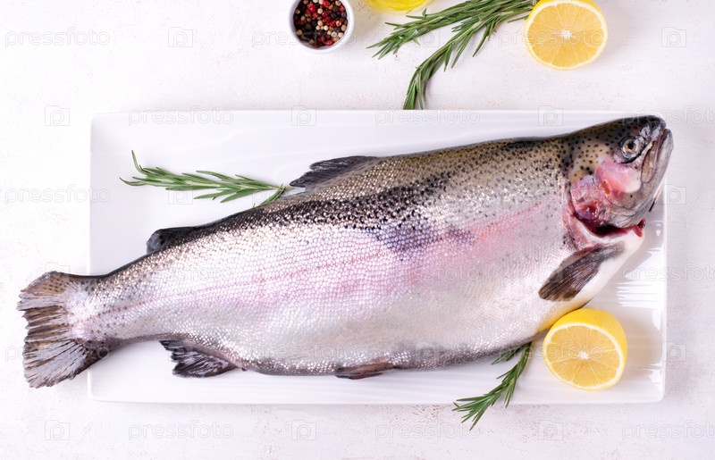 Свежая целая радужная форель на белой тарелке и ингредиенты для приготовления пищи. Вид сверху
