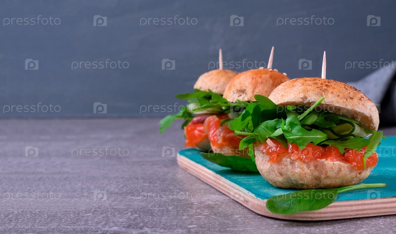 Бургеры с соленой форелью, рукколой и огурцом подаются на сером столе. Закуска из морепродуктов. Макет с копией пространства
