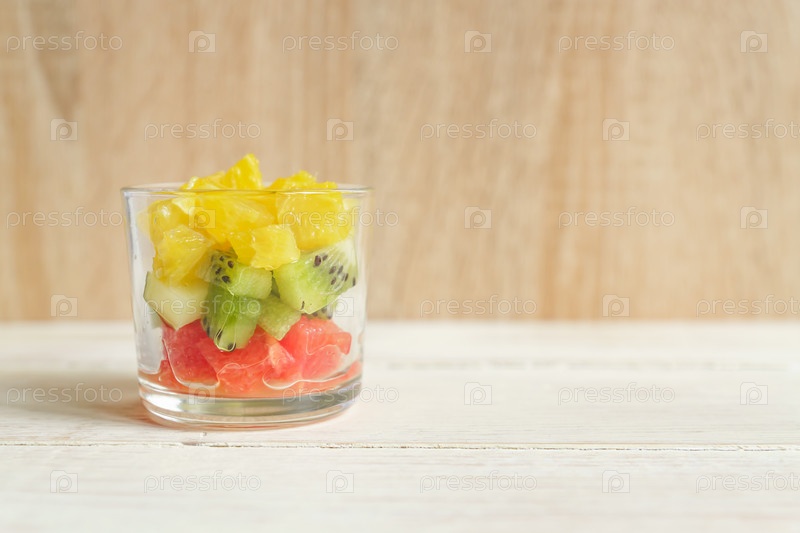 Диета Свежий вкусный фруктовый салат в стеклянной банке на деревянном столе. Нарезанные сочные апельсины, киви и грейпфруты