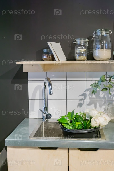 Мойте металлическую раковину и различные стеклянные банки на металлическом столе рядом с корзиной с цветами. Оформление цветочного магазина
