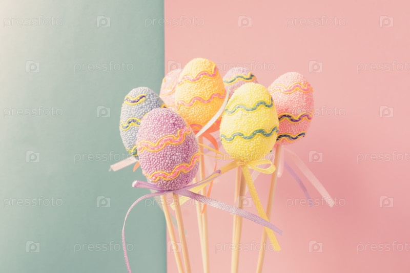 Пасхальные красочные украшенные яйца стоят на палочках на голубом и розовом фоне. Минимальная пасхальная концепция. Счастливой Пасхи открытка с копией пространства для текста