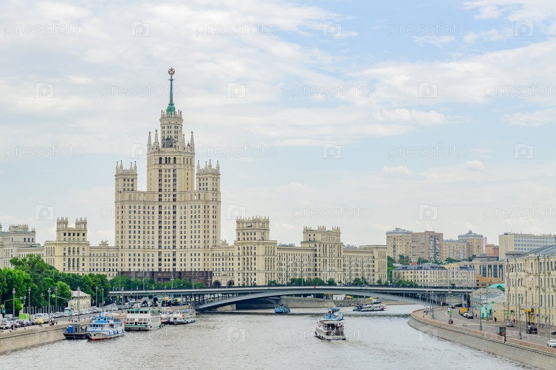 Москва, Россия - 30 мая 2019 г.: Вид на Москворецкую набережную с движением транспорта и небоскребом с плавучего моста