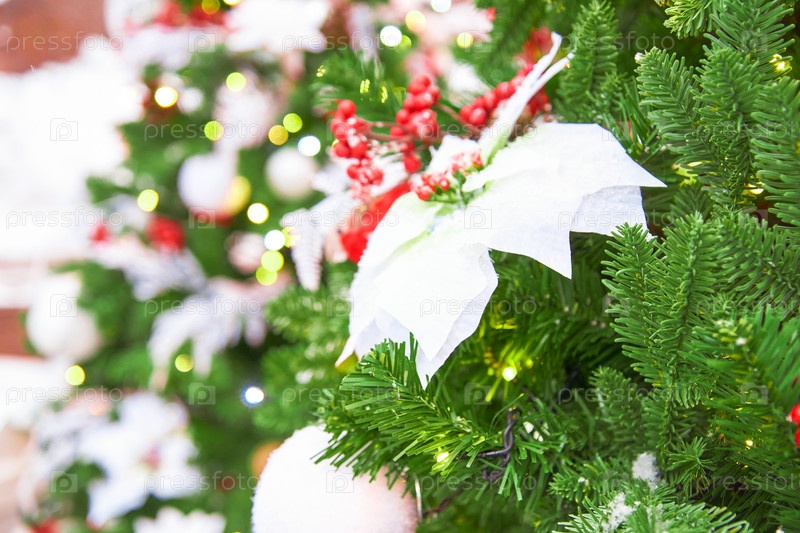 Закройте рождественскую елку, украшенную пуансеттией и гирляндой с включенными огнями. Праздничный фон с копией пространства для ваших проектов