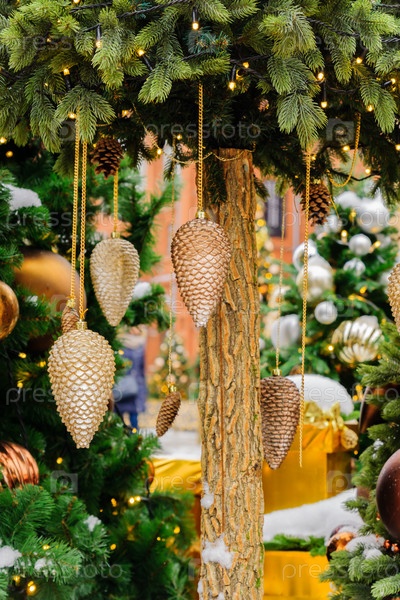 Закройте рождественские елки, украшенные сверкающими шишками и гирляндами с включенными огнями. Праздничный фон с копией пространства для ваших проектов