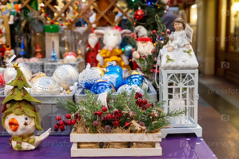 МОСКВА, РОССИЯ - 18 декабря 2019 года. Главный универмаг ГУМ. Новогодняя и рождественская ярмарка. Крупным планом рождественские игрушки для продажи в корзинах. Подарки для туристов