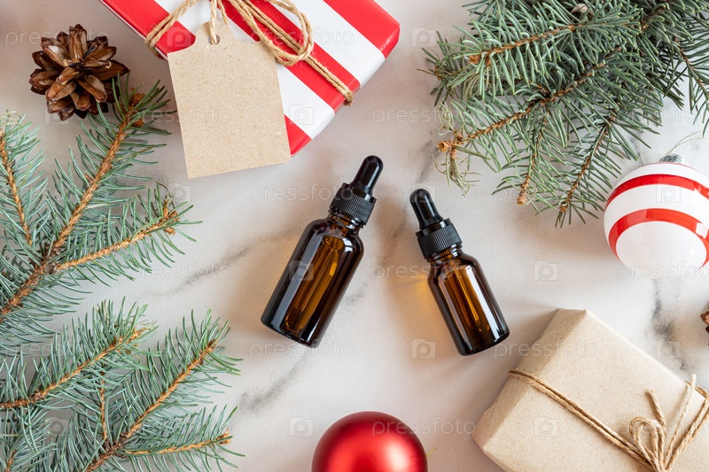 Рождественский спа-концепт и зимние продукты по уходу за кожей, масло для лица, еловые ветки, подарочные коробки и шишки на мраморном фоне, плоская планировка, пространство для копирования. Сезонная рутина красоты и концепция ухода за кожей