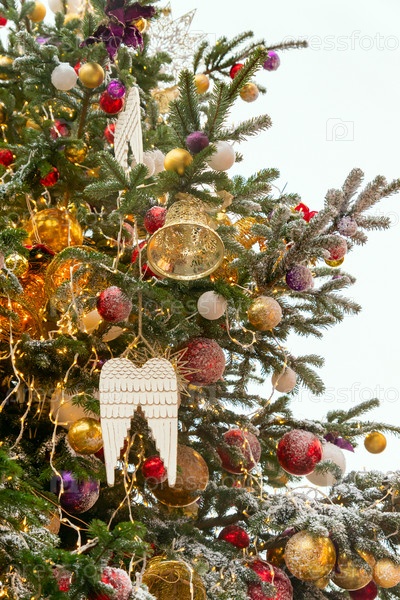 Закройте украшение елки безделушками и снежной глазурью. Праздничная открытка на зимние праздники в золотых тонах