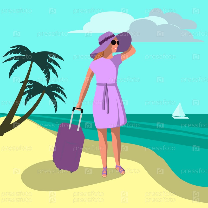 Девушка с багажом на тропическом пляже. Летний пейзаж для открыток, баннеров. Цветная векторная иллюстрация в плоском стиле