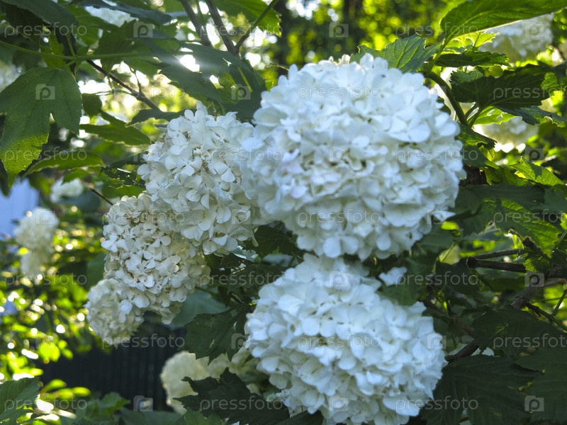 Декоративная калина бульденеж (Снежный шар) цветет в саду