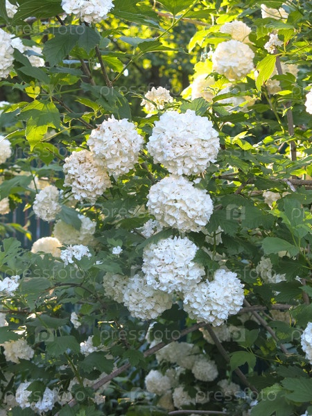Декоративная калина бульденеж (Снежный шар) цветет в саду