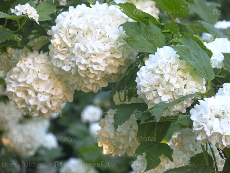 Декоративная калина бульденеж (Снежный шар) цветет в саду
