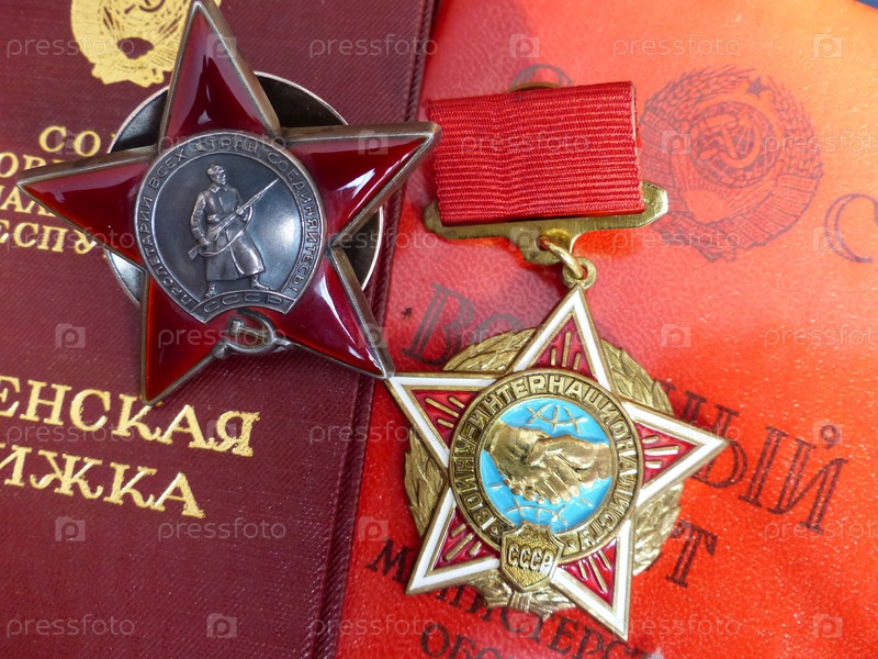 Орден "Красной Звезды" и знак "Воина-интернационалиста. СССР". Крупный план. Семейная реликвия. На фоне документов