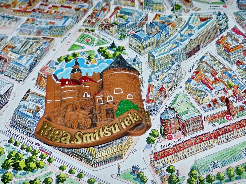Керамический значок на фоне туристической карты Риги. Вецрига - Старая Рига. Текст карты на латышском языке. Карта планирования путешествия. Туристический маршрут