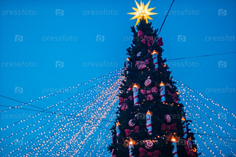Новогодняя елка с украшением на улице вечером