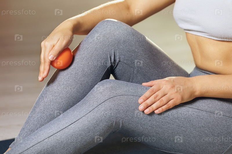Женщина выполняет миофасциальное расслабление мышц голеностопного сустава с помощью массажного мяча в домашних условиях. Концепция предотвращения усталости ног и самомассажа