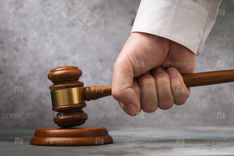 Молоток судьи в руке на фоне серой стены, концепция вынесения приговора