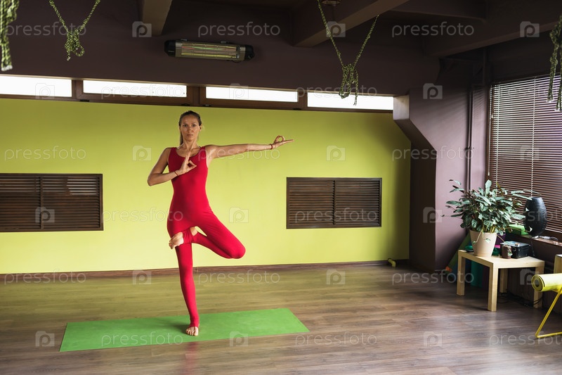 Женщина выполняет упражнение врикшасана с жестом сознания, поза дерева, стоит на коврике в студии, тренируется в красном спортивном комбинезоне