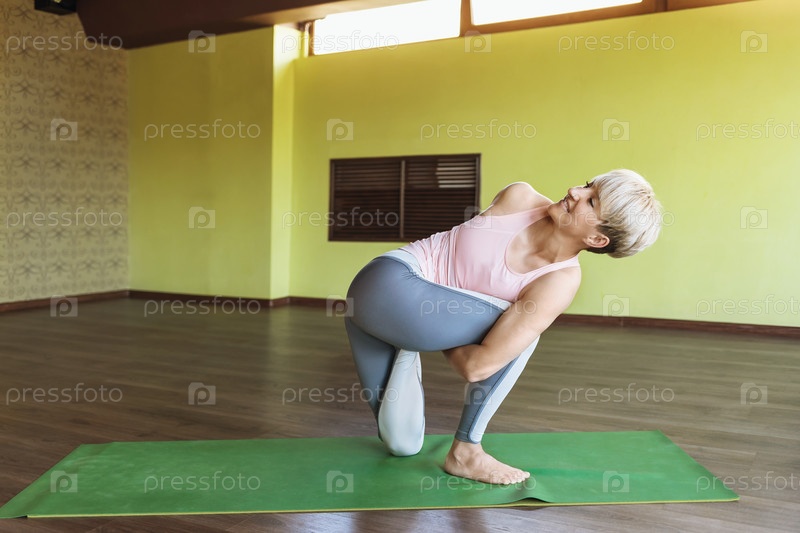 Привлекательная женщина в спортивных леггинсах и майке, тренируется в студии, выполняет упражнения ватаджанасаны, позу лошади