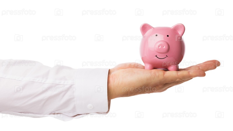 Мужчина держит копилку на ладони, изолированную на белом фоне, шаблон для дизайнеров