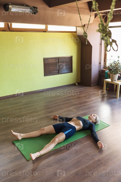 Женщина занимается йогой, отдыхает после тренировки, выполняет упражнения шавасана с практикой дыхания пранаямы