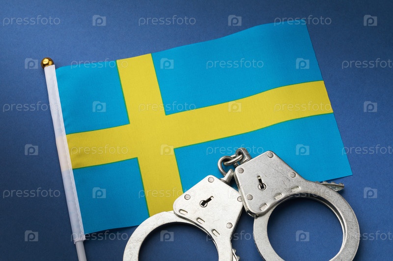 Флаг Швеции и наручники на синем фоне, концепция преступности в стране