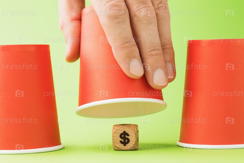 Приподнятое стекло и деревянный куб с символом доллара внизу, концепция азартных игр наперсток