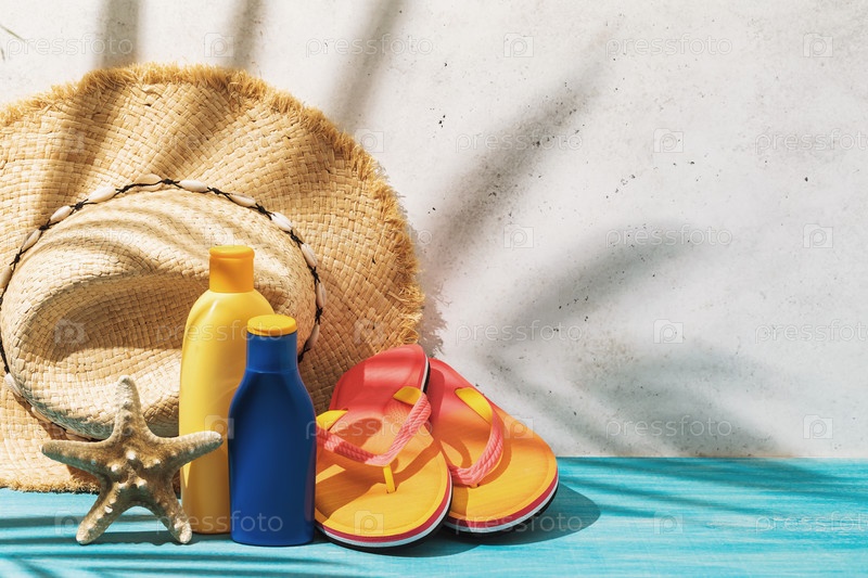 Соломенная шляпа, солнцезащитный крем, пляжные тапочки и морская звезда на столе, летний фон