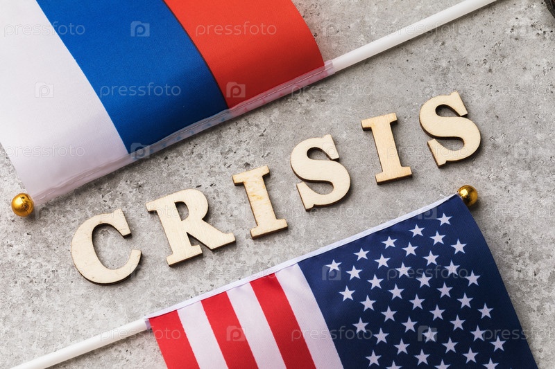 Текст из деревянных букв и двух флагов, концепция кризиса в отношениях между Россией и Америкой