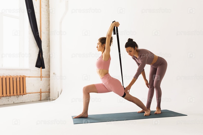 Тренер-женщина помогает ученику правильно выполнять упражнение Вирабхадрасана 1, поза воина, они проводят тренировку в светлой студии возле окна с поясом