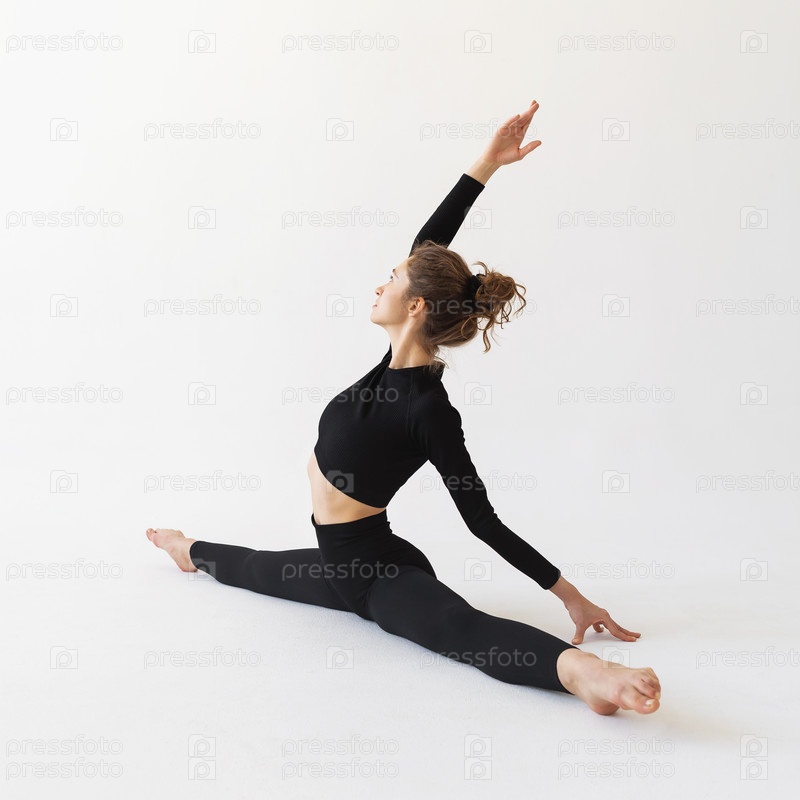Молодая женщина занимается растяжкой мышц ног, выполняет поперечный шпагат на белом фоне