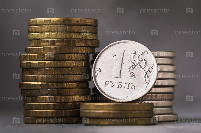 Один российский рубль на фоне монет крупным планом