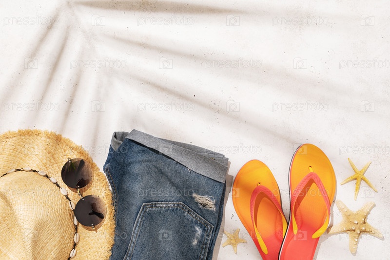 Женская соломенная шляпа, солнцезащитные очки, шорты и шлепанцы на светлом фоне с копией пространства, летний фон