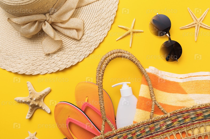 Плоская композиция с аксессуарами для пляжного отдыха на цветном фоне с видом сверху, летний фон